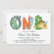 Convide sua família e amigos para comemorar o primeiro aniversário do seu filho com estes bonitos convites ao Dinossauro. Este design apresenta um roteiro de tipografia com dinossauros coloridos. Perfeito para o tema da festa Dino.