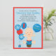 Celebrando um primeiro aniversario? Conseguiu um bolo? Este convite é feito sobre um fundo azul claro com uma borda vermelha brilhante em todos os lados. Há balões vermelhos e azuis voando ao lado de um bebê adorável vestindo uma fralda azul brilhante com um cupcake na frente dele. O gelo é azul brilhante. Ele está segurando um balão que diz "Parabéns"! Personalize com suas informações de partido no topo. Veja todos os outros designs, cores e produtos que temos em nossa loja. ©JW Ilustrations