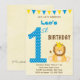 Convite de aniversário com tema de leão giro e combinação de cores azul, amarelo e marrom.