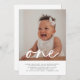 Um simples convite de Primeiro Aniversário com sua foto e a palavra 'um' sobre o topo em uma letra com estilo caligrafia. Você pode editar todo o texto e adicionar sua própria foto.