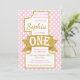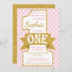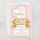Primeiro Convite de Aniversário rosa e Dourado © Puggy Impressões. Todos os direitos reservados. ● Os detalhes de brilho são simulados no trabalho de arte. No fazer deste produto não será utilizada qualquer brilho real.
