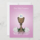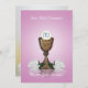 Primeiro convite à comunhão com cálice de ouro e rosas brancas em fundo rosa