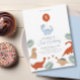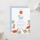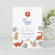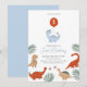 O primeiro Convite de festas do Dinossauro apresenta um dinossauro azul pastel segurando um balão vermelho com o dentro número 1 do balão em um cenário de temas coloridos e divertidos de dinossauros. Personalize-o com a idade, o nome e os detalhes da festa do seu filho.