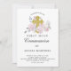 O convite muito bonito da Primeira Comunhão apresenta uma cruz de ouro rodeada por rosas rosas e folhas verdes de sábio. As fontes tradicionais dão a este convite uma aparência clássica.