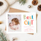 Celebre a sua mais nova bênção com este cartão de Natal moderno e divertido para anunciar o nascimento. Com um design colorido de “Melhor Presente” e espaço para a foto do seu bebê, ele captura perfeitamente a alegria da chegada no Natal. Ideal para compartilhar o nome do seu recém-nascido, detalhes do nascimento e primeira saudação de Natal com os entes queridos. Adicione seu texto personalizado para um presente cheio de calor e alegria. Personalize o seu hoje.