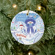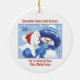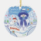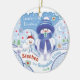 Era uma vez, havia um ornamento muito especial para um neto muito especial. Este ornamento era especial porque era o primeiro Natal do menino. Este é um adorável ornamento cerâmico redondo com dois personagens de Snowbie ilustrados na frente. Um menino Snowbie e o seu cão de neve. A parte de trás é ilustrada com o menino Snowbie abraçando o filhote e também com um pequeno verso de Natal. Em tons suaves de azul com toques de vermelho, este adorno redondo bonito parecerá excelente no quarto de uma criança ou numa árvore de Natal. Personalize a frente com o nome do seu neto e as costas com o ano, e você tem um presente que vai durar para sempre.
