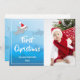 Primeiro cartão plano de fotos de Natal com um tubarão de desenho animado em um chapéu de Papai Noel. Todas as palavras podem ser personalizadas.
