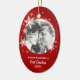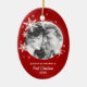 Enfeites de natal personalizados com o design moderno que caracteriza os flocos de neve brancos do inverno na foto vermelha e redonda. Uma lembrança bonita para seu primeiro Natal junto!