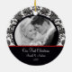 Nossos primeiros enfeites de natal da foto caracterizam um fundo preto & branco bonito do damasco com uma banda vermelha! Personalize com sua informação e data e você são todos ajustam-se para ir! Presente datado maravilhoso da lembrança para seu primeiro Natal e uma grande adição a você coleção dos enfeites de natal.