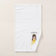A toalha de banho da garota bonita foi feita em um tema da princesa. A toalha de banho é feita em branco, com uma coroa amarela ouro. A toalha da mão é branca com gráficos de desenho de uma princesa morena vestida de amarelo, com nome personalizado feito em um texto marrom arquivado. O pano de lavagem é feito em um padrão de quatrefoil amarelo e branco com uma coroa grande. Uma toalha doce para o banheiro de qualquer jovem.