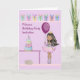 Convite de aniversário princesa para crianças. A design é uma doce criança escura e escura com um balão, um bolo, gato, mesa e presentes. A menina está vestindo uma coroa princesa.