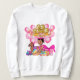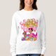 Ilustração de uma adorável menina vestida de rosa, com cabelo em pães com arcos rosa e princesa tiara. Cercado por brinquedos e com balões cor-de-rosa e dourados acima com estrelas e faixa lua. Bonito presente para esperar pais, chás de fraldas, revelação de gênero ou presente de aniversário de bebês.