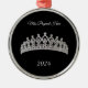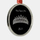O enfeites de natal é apresentado em forma redonda, com um cintilante bonito cristal de Prata tiara, com texto branco sobre fundo preto. Mostrada com fita vermelha e prateada. Personalize este item e altere o texto do exemplo com o nome pessoal do candidato, data ou outro.