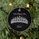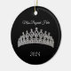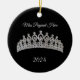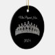 O ornamento cerâmico de Natal é apresentado em forma redonda, com uma tiara de cristal prateado cintilante com texto branco sobre fundo preto. Personalize este item e altere o texto do exemplo com o nome pessoal do candidato, data ou outro.