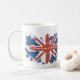 Comemore o nascimento do membro o mais novo da família real com esta caneca da lembrança de Union Jack do grunge decorada com uma versão moderna de Union Jack. Esta caneca comemorativa é projetada com a data de nascimento dos príncipes pequenos.