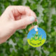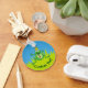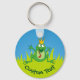 Cartoon Príncipe sapo com coroa sobre grama verde sob céu azul. Texto personalizado de ambos os lados.