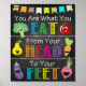 VOCÊ É O QUE COME DA CABEÇA AOS PÉS! Printable Cafeteria or Health Room Healthy Comating Poster para Lunchroom, Health Cliny, School Office e Cafeteria Decor! Uma maneira fofa de adicionar personalidade e decoração brilhante e divertida à sala de almoço, à sala de saúde ou à cafeteria da sua escola! O poster apresenta um fundo de quadro relativo falso com letras coloridas brilhantes e gráficos de desenho de comida divertidos - impressões lindamente!