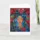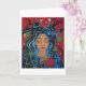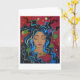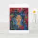 Cartão de saudação único e vibrante, mostrando uma mulher meditativa com cabelo preto, azul e verde saindo de seu rosto. Excelente de enviar saudações pessoais ou palavras de encorajamento para aqueles indivíduos menos populares.