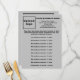 Cartão de menu plano que você pode personalizar e usar como material de marketing para anunciar ou promover seus produtos ou serviços. Cartão personalizável para mostrar a lista de seus produtos ou serviços e preços. Designs são textos pretos sobre fundo de cinza e forma retangular de formato de retrato. Para personalizar esta placa de menu simples, carregue o logotipo da sua empresa, digite o nome da sua empresa ou empresa, endereço, número de telefone, correio eletrônico, site ou página de mídia social, seus produtos ou serviços, preços e uma descrição curta, mas atraente da sua empresa. Após carregar o logotipo e digitar textos, verifique a aparência da fonte e dos lados traseiros. Se a aparência lhe agrada, você pode colocar seu pedido agora. Se precisar redimensionar e mover o logotipo e os textos para o ajustado nesta placa de menu plana ou em outras formas, tamanhos e estilos que você escolher, mude na ferramenta design. Você também pode fazer outras alterações de acordo com a aparência preferida na ferramenta design, como alterar a cor do fundo, a cor da fonte, o estilo da fonte, editar textos, adicionar textos e excluir textos.