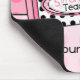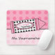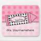 Um mousepad que caracteriza um fundo cor-de-rosa com bolinhas cor-de-rosa. Ilustração de combinar o pastel cor-de-rosa no centro. A etiqueta do pastel é branca com bolinhas pretas. O texto no pastel lê o "5o professor da categoria." Personalize com seu nome.