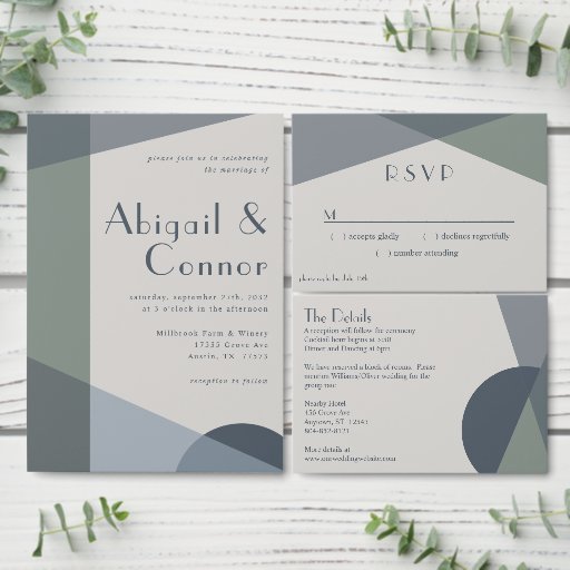 Elementos: formas geométricas de abstrato, blocos de cores, fonte sans sans sif de chic para nomes, fontes serif subindicadas para detalhes. Cores: sábio, hortelã, pistácio, verde, azul empoeirado, botânico, marinho, noite, meia-noite, cetáceos, pergaminho, cinza clara, platina. Temas: modernos, minimalistas, abstrato, limpos, alegres, legal tons, subestimados, boho, scandi, contemporâneos, industriais. Coleção: Abstrato Geométrico Marinho Sage Geométrico Dusty Blue Wedch Tipo de Produto Coletivo: Programa
