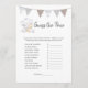 Um jogo divertido para a festa de revelação de gênero é o jogo de adivinhação do preço. Este jogo apresenta uma cinza de prata e um banner marrom no topo e um elefante bebê abraçando um cachorro bronzeado. No verso está um elefante bebê sorrindo com seu tronco erguido para cima com modelos.