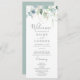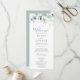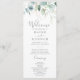 Este programa de casamento de areia e folha de ouro é perfeito para um casamento moderno. O elegante design botânico apresenta uma aquarela clara e arejada, eucalipto, acentuado com folhas de brilho de ouro branco. Inclua o nome da noiva e do noivo, a data e o local do casamento, a mensagem do obrigado, a ordem do serviço, a festa noiva e um memorial "em memória amorosa" opcional.
