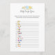 Um jogo divertido para o chá de fraldas é o jogo Baby emojis. Este cartão de jogo apresenta florais azuis no topo. Ao contrário, um ursinho de pelúcia se debruça sobre um barril de mel observando uma abelha de mel com modelos.