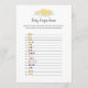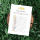 Um jogo divertido para a festa de revelação de gênero é o jogo Baby emojis. Este cartão de jogo apresenta florais amarelos no topo. Ao contrário, está um ursinho de pelúcia que se inclina sobre um barril de mel observando uma abelha de mel com modelos.