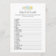 Um jogo divertido para o chá de fraldas é a palavra do bebê. Este cartão de jogo apresenta florais azuis no topo. Ao contrário, um ursinho de pelúcia se debruça sobre um barril de mel observando uma abelha de mel com modelos.