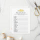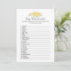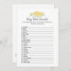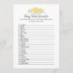 Um jogo divertido para a festa de revelação de gênero é o jogo de palavras do bebê. Este cartão de jogo apresenta florais amarelos no topo. Ao contrário, está um ursinho de pelúcia que se inclina sobre um barril de mel observando uma abelha de mel com modelos.