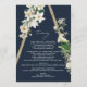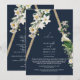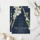 Uma bela pirâmide de madeiras rústicas de estilo boêmico com florais brancos de aquarela em cascata no lado e fundo azul. Um design único que usa botânicos brancos de coloração branca vintage em uma estrutura triangular boêmica. Um design floral branco encantador com características rústicas e geométricas e uma tipografia elegante da escrita. Uma elegante design de cartas itinerantes de casamento com elementos modernos. Os convites de casamento e outros artigos de papelaria também estão disponíveis.