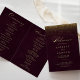 Este programa de casamento dobrado por uma caligrafia de ouro burgundy é perfeito para um casamento russo. O design simples e na moda apresenta a tipografia clássica e a tipografia do rico em ouro com brilho em fundo burgundy. Inclua uma citação ou mensagem curta, ordem de serviço, festa de casamento e obrigado da mensagem.