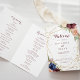 Este programa de casamento dobrado por caligrafia de ouro geométrico é perfeito para um casamento moderno. O design apresenta uma aquarela desenhada à mão, púrpura, marinho, pincel, burgundy, flores marinhos, folhas verdes e douradas que adornam uma elegante moldura geométrica. Inclua uma citação ou mensagem curta, ordem de serviço, festa de casamento e obrigado da mensagem.