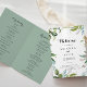Este programa de casamento dobrado em caligrafia tropical verde é perfeito para um casamento moderno. A design apresenta folhas tropicais predominantemente verdes com um toque de flores rosadas cor-de-rosa bem dispostas em coroas elegantes e formas geométricas. Inclua uma citação ou mensagem curta, ordem de serviço, festa de casamento e obrigado da mensagem.