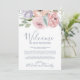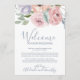 Estas cartas de boas-vindas e itinerário com florais rosa empoeirado são perfeitas para um casamento de primavera ou verão. O design floral romântico apresenta flores lilás roxo, rosa e pêssego dispostas em um lindo buquê pastel suave. A frente do cartão apresenta uma carta de boas-vindas e a parte de trás apresenta o itinerário do casamento. Essas notas são perfeitas para casamentos de destino e sacolas de boas-vindas de hóspedes de hotel.