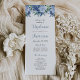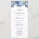 Um belo programa de casamento que apresenta uma borda floral superior de flores aquáticas em tons de azul. Os nomes da noiva e do noivo e as subposições figuram em caracteres decorativos azuis elegantes e poeirentos.