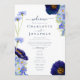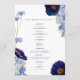 Belas flores silvestres e folhagens únicas pintadas à mão em aquarela em tons de azul rosado, azul centáurea, azul marinho, roxo e verde, ideais para um programa de casamento em um dia de primavera ou verão. A elegante tipografia moderna em azul marinho complementa a deslumbrante arte pintada à mão boho caprichosa, que inclui centáureas, papoulas, cosmos, miosótis e folhagens delicadas. O programa de casamento chic boêmio inclui detalhes da cerimônia e a festa de casamento com modelos fáceis de personalizar, perfeitos para um casamento em um prado de primavera ou jardim de verão. Arte original da artista Catherine Sweetman.