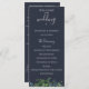 Folhagem da floresta em aquarela rústica, programa de casamento azul marinho. O programa apresenta várias linhas para listas de texto personalizadas para a ordem dos eventos da cerimônia, festa de casamento e nota de agradecimento.