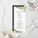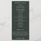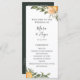 Casamento rústico elegante em pomar de laranja, folhagem botânica de citrinos, programa de casamento. Texto modelo lista para ordem de eventos da cerimônia, cortejo e nota de agradecimento. Cor de fundo mostrada em verde caçador escuro coordenado, pode ser personalizado.
