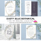 Folhas e florais azuis empoeirados de cor aquosa romântica. Adicione seus detalhes de casamento, mude as cores da fonte, os tamanhos ou os estilos de fonte. Esta elegante design de coroa botânica é ideal para casamentos de primavera e verão.