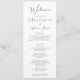 Programa Elegante de Casamento Negro e Branco. Design Elegante minimalista com uma reviravolta moderna com um texto clássico e nítido de escritura negra em branco marfim. Projetado por Austen & Grace. Personalize com os detalhes do seu programa de casamento, nomes de noivas e noivos, obrigados, detalhes da cerimônia, data do casamento, localização e festa de casamento traseira, etc. Todo o texto, fontes, posicionamento e cores frontal e traseira podem ser personalizados por você. Convidamos você a visitar nossa loja Zazzle para ver produtos correspondentes e muito mais. Entre em contato conosco se precisar de assistência.