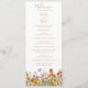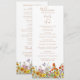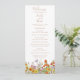 O programa de casamento country das flores selvagens coloridas apresenta flores bonito em cor laranja, amarela, roxa e rosa sobre fundo branco com a ordem de cerimônia na frente e festa de casamento e obrigado no sentido inverso em um roteiro de caligrafia dourada moderno. Personalize editando o texto nas caixas de texto. Projetado para você pelo Evco Studio www.zazzle.com/store/evcostudio