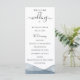 Elegantes e modernas bordas de aquarela azul com efeito dip dye, programa de casamento. Programa apresenta caligrafia fofa de "casamento" com várias linhas para listas de texto personalizadas para a ordem dos eventos da cerimônia, festa de casamento e nota de agradecimento.