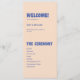 Programa Moderno de Casamento de Beige Azul. Personalize com nomes de noivas e noivos, sua localização e data de casamento, ordem de serviço e nomes de festas noivas no fundo.