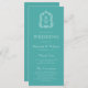 Este elegante programa de casamento inspirado em vintage apresenta um par de iniciais monográficas brancas em letra serif aberta acima e abaixo de uma linha divisória e rodeadas por uma crista botânica de arte em linha num fundo turquesa.