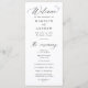 Mande seus convidados através de seu dia especial com este elegante programa de casamento com caligrafia negra graciosa em um fundo branco nítido. Perfeito para casamentos em qualquer época e adequado para comemorações formais e casuais, este design moderno e eterno permite que os casais personalizem a frente com seus nomes, data do casamento e detalhes da cerimônia em letras negros. O verso mostra os nomes do seu partido, acrescentando um toque pessoal e atencioso. Combinando simplicidade com sofisticação, este programa de casamento maravilhosamente projetado garante que seus hóspedes se mantenham informados enquanto complementam a estética refinada do dia do seu casamento.
