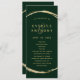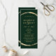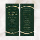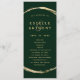 Este programa de casamento apresenta um falso círculo dourado com uma elegante e uma caligrafia simples com um fundo verde da floresta.
