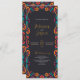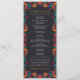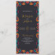 Este design do Programa de Casamento de Arte Folclonal Tradicional Floral Mexicana apresenta uma vibrante fronteira floral que enquadra um fundo negro arrojado, criando uma aparência festiva e convidativa. A borda apresenta um arranjo simétrico de flores laranja, vermelhas, rosa e azuis, acentuadas com flores borbulhantes e laranja, pontos brincalhões e elementos folhosos. O centro é vazio esquerdo, oferecendo amplo espaço para texto personalizado enquanto é elegantemente fechado por padrões animados e inspirados na arte popular.