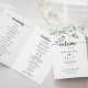 Este clássico programa de casamento dobrado de eucalipto verde é perfeito para um casamento rústico. A design apresenta lindas folhas verdes de eucalipto com aquarela. Inclua uma citação ou mensagem curta, ordem de serviço, festa de casamento e obrigado da mensagem.
